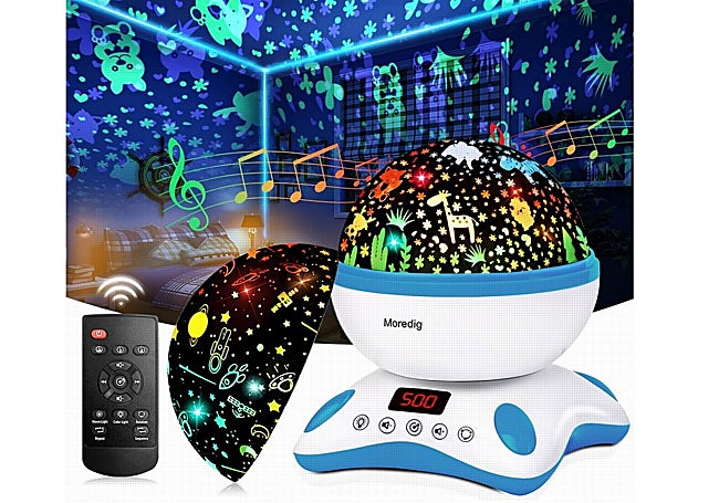 El Moredig Proyector Estrellas Bebé con su diseño moderno en azul, ilumina y reproduce música relajante, creando un ambiente perfecto para el descanso infantil. La proyección de 360° cubre la habitación con estrellas y animales, estimulando la imaginación.