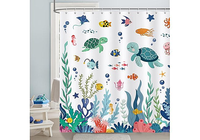 La cortina de ducha Bonhause presenta estampados coloridos de animales marinos y está fabricada con tejido de poliéster impermeable y suave. Es resistente al moho, lo que facilita su mantenimiento. Incluye 12 ganchos y ojales metálicos reforzados para una instalación sencilla y duradera.