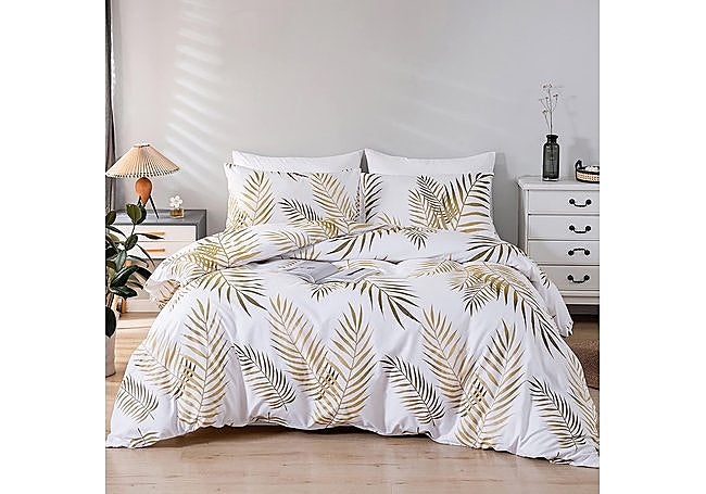 Presenta un diseño botánico dorado sobre microfibra suave, este juego de funda nórdica Jemiipee incluye cierre de cremallera invisible y lazos en las esquinas para una fijación segura. El tejido resistente al encogimiento y fácil de mantener garantiza durabilidad y un aspecto elegante, aportando un toque decorativo actual a cualquier dormitorio. Incluye dos fundas de almohada a juego.