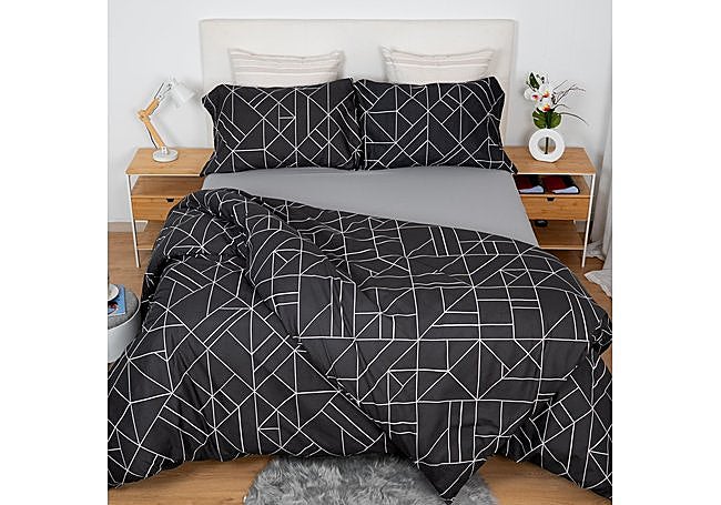 El juego de funda nórdica Dreamzie para cama de 150 cm cuenta con un estampado geométrico reversible que aporta versatilidad al dormitorio. Está fabricado en microfibra con certificación Oeko-Tex. Incluye una cremallera camuflada y sujeciones internas para mantenerlo en su lugar. Es fácil de cuidar, ya que se puede lavar a 40ºC.