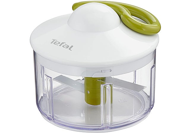 Tenemos aquí una picadora de Tefal. Pero ojo, que no es un electrodoméstico: se trata de una picadora manual. Como lo oyes: funciona con un sistema de cuerda enrollada que hace girar las cuchillas. De manera que no sólo vas a ahorrar tiempo, sino también una buena cantidad de dinero en tu factura de la luz.