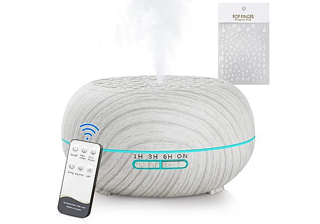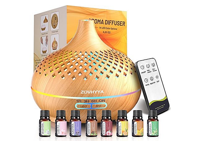 Con control remoto y gran depósito de 500 ml, el difusor ZOVHYYA tiene 14 colores LED y cuatro modos de temporizador. Incluye ocho aceites esenciales. Funciona de manera silenciosa y cuenta con apagado automático. Su diseño permite la difusión prolongada de fragancias en cualquier estancia.