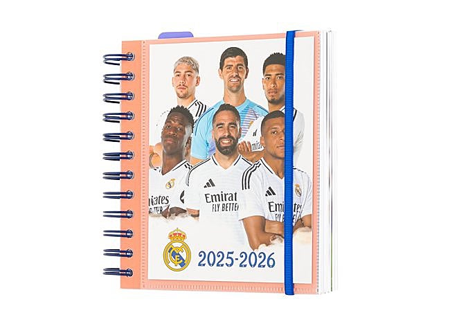 Para los fans del Real Madrid, esta agenda escolar día por página A5 de Grupo Erik destaca por su portada doble y detalles futbolísticos. Pensada para acompañar a estudiantes durante el curso 2025-2026, combina anillas metálicas, cubierta rígida y banda elástica para resistir el uso diario en la mochila.