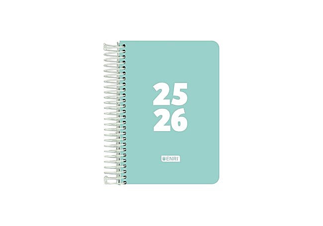 El modelo Enri 2025-2026 ofrece formato día por página en tamaño compacto (12x18 cm) y presenta una cubierta plástica verde menta, resistente y fácil de limpiar. Su encuadernación en espiral permite abrirla completamente y escribir cómodamente.