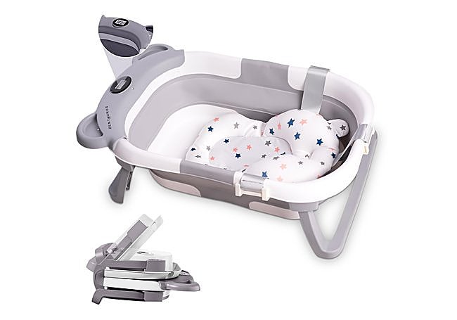 El termómetro integrado facilita mantener la temperatura ideal del agua, evitando preocupaciones y garantizando el bienestar del bebé. Además, la esponja de silicona incluida resulta perfecta para cuidar la piel delicada, mientras el sistema de plegado permite guardar la bañera en cualquier rincón, ideal para hogares con poco espacio o para llevarla de viaje.