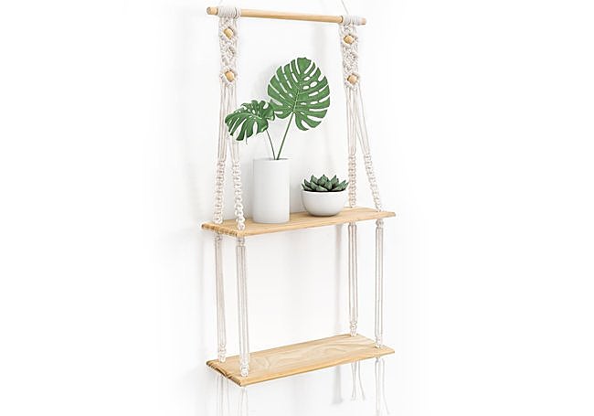 Estantería colgante hecha a mano con madera natural y cuerdas resistentes, de diseño bohemio-minimalista y dos niveles. Su estructura ligera facilita el colgado en distintos tipos de pared y permite exhibir objetos pequeños. Las dimensiones compactas favorecen su integración en espacios diversos. El acabado está pensado para uso interior y exposición visible.