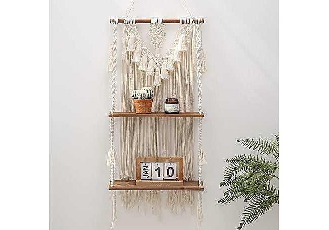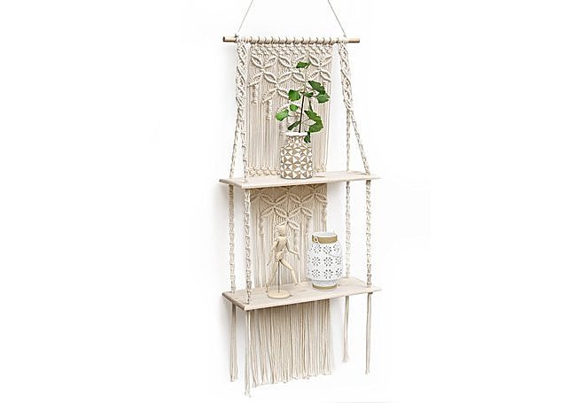 Estante colgante de macramé con baldas de madera maciza y cuerda de algodón; incluye tres niveles ajustables. La estructura rectangular de 36 cm ofrece espacio para pequeños objetos decorativos y requerirá anclajes adecuados para su montaje. Los materiales naturales y el diseño aportan una estética rústica. El producto está orientado a uso interior y decoración.