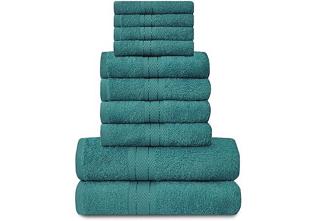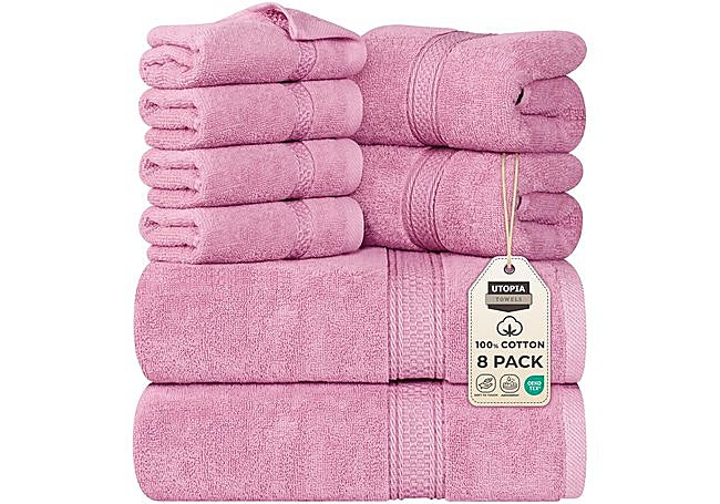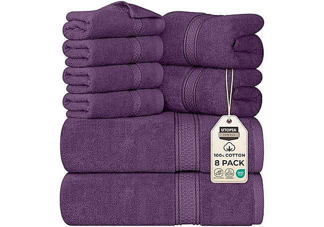 Acabado en un atractivo tono ciruela, este juego de toallas de Utopia Towels presenta ocho piezas confeccionadas en algodón 100% hilado en anillo. El conjunto incluye dos toallas de baño, dos de mano y cuatro toallitas, todas con doble dobladillo, lo que aporta resistencia y una presencia cuidada en cualquier baño.