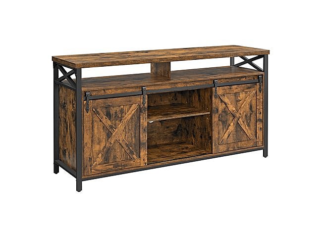 Este mueble para TV de VASAGLE destaca por su diseño industrial, con puertas tipo granero y marco metálico negro que aportan carácter al salón. Su tablero soporta televisores de hasta 65 pulgadas y 91 kg. Incluye estantes ajustables en compartimentos abiertos y cerrados, ideales para organizar consolas y dispositivos multimedia. Los orificios traseros facilitan la gestión de cables, y las patas regulables garantizan estabilidad en suelos irregulares.