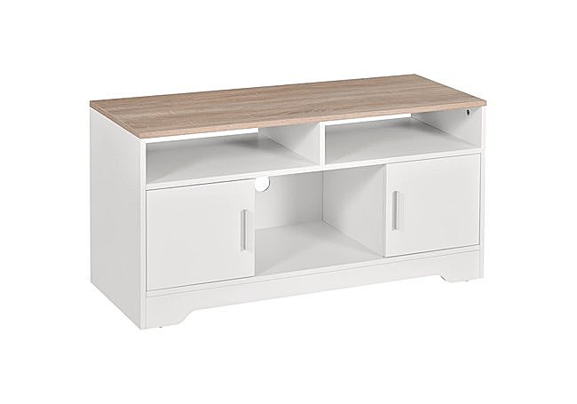 Dispone de dos armarios con estantes ajustables para organizar dispositivos y accesorios. Los orificios traseros facilitan la gestión de cables, y las bisagras amortiguadas aseguran un cierre suave. Su estructura de MDF robusto y el sistema antivuelco aportan seguridad y estabilidad, siendo apto para televisores de hasta 58 pulgadas.