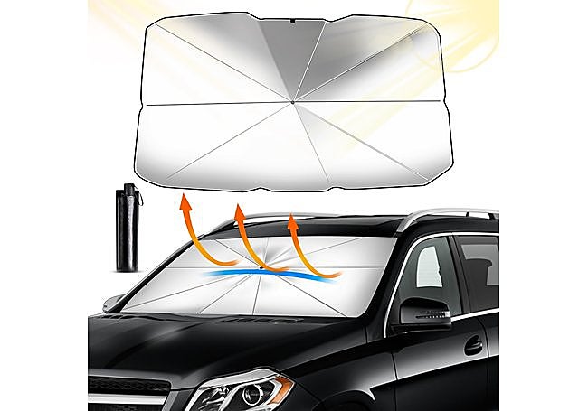 Su estructura robusta, con ocho varillas y materiales resistentes al calor, mantiene el interior fresco y protegido frente a los rayos UV. El mango de silicona suave evita arañazos en el salpicadero. Es ideal para quienes aparcan a pleno sol y desean preservar la tapicería y el salpicadero.