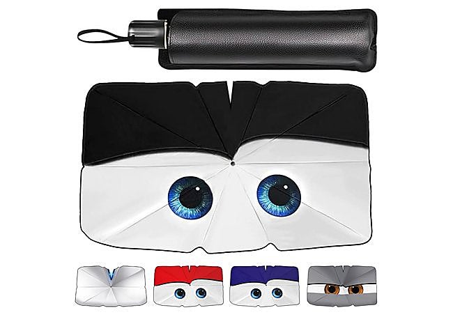 El parasol universal Zuquik no es solo un accesorio, sino una protección solar con un diseño distintivo de ojos animados. Fabricado con titanio plateado y costillas de acero, ofrece una cobertura de 145 x 79 cm, adaptándose a la mayoría de parabrisas. Bloquea el calor y los rayos UV, manteniendo el interior del vehículo fresco y protegiendo la tapicería.