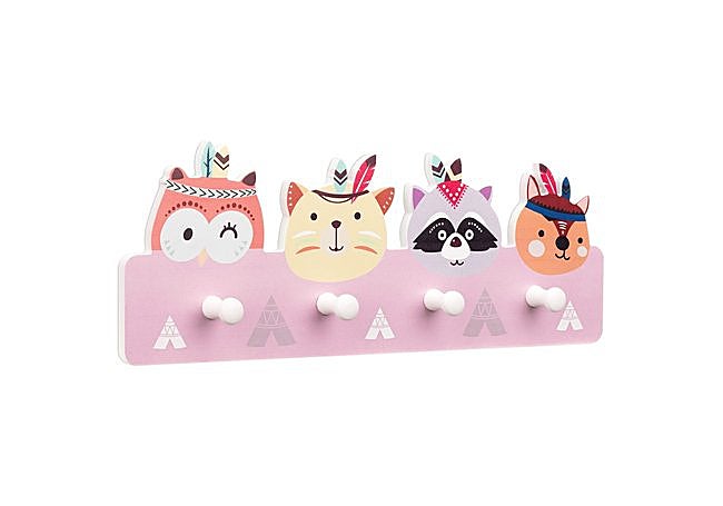 Con un diseño alegre de animales y tipis, este perchero de pared Navaris transforma el ambiente infantil en un espacio más organizado y divertido. Fabricado en madera blanca, ofrece cuatro ganchos resistentes pensados para colgar abrigos, mochilas o toallas, y su tamaño compacto se adapta fácilmente a cualquier rincón del dormitorio o baño.
