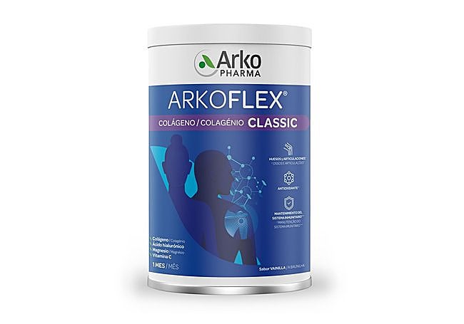 Arkoflex Colágeno Classic Vainilla de Arkopharma transforma el cuidado articular en una experiencia agradable gracias a su sabor a vainilla. Su fórmula combina colágeno hidrolizado tipo I, magnesio, ácido hialurónico y vitamina C, que contribuyen al mantenimiento de huesos, cartílagos y piel. El magnesio apoya la estructura ósea y la vitamina C favorece la formación de colágeno, ayudando a conservar la elasticidad cutánea.