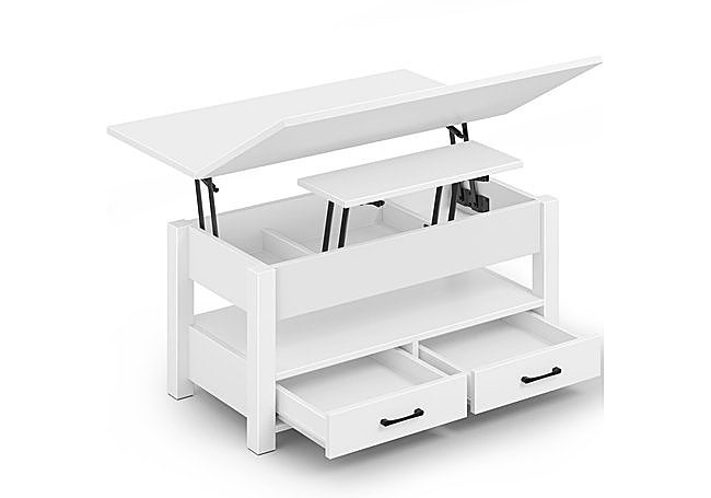 Con un diseño moderno y tablero elevable dividido, la mesa de centro Rolanstar permite dos zonas de uso independientes. Incorpora tres compartimentos ocultos, dos cajones y un estante abierto, facilitando la organización. La estructura robusta y el mecanismo de gas metálico garantizan estabilidad y suavidad en la apertura, mientras la superficie blanca ofrece resistencia y fácil limpieza.