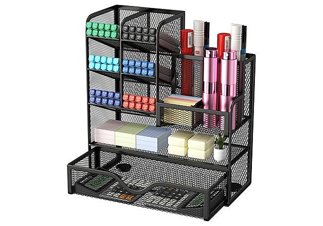 Con estructura de malla metálica negra, el organizador Comzantor ofrece doce compartimentos y un cajón deslizante que permiten clasificar material de oficina de forma eficiente. Sus dimensiones compactas y el acabado robusto facilitan el ahorro de espacio, mientras que las almohadillas protectoras en la base garantizan estabilidad y evitan daños en la superficie del escritorio.