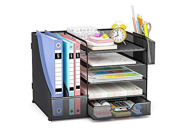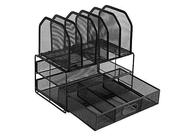 Organizador de escritorio de malla negra con cinco secciones verticales para documentos, doble bandeja y un cajón deslizante. Su estructura robusta facilita el almacenamiento ordenado de papeles y pequeños objetos. El montaje es sin herramientas y el diseño es duradero.