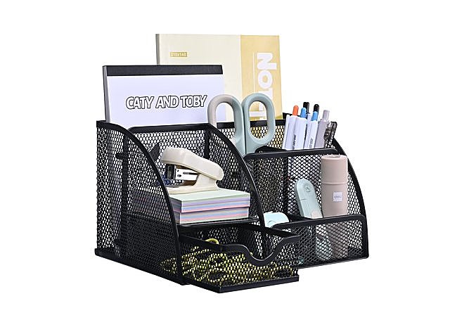 Fabricado en malla metálica resistente, este organizador de escritorio MumdoYAL incluye varios compartimentos y un cajón, lo que facilita la clasificación de bolígrafos, notas adhesivas y pequeños accesorios. Su diseño compacto y acabado repelente al agua aportan durabilidad y un aspecto elegante, mientras que las almohadillas protectoras en la base evitan arañazos en la superficie del escritorio.