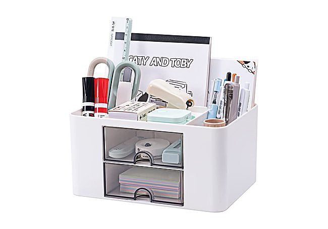 Diseñado con estructura compacta, este organizador de escritorio incorpora cinco compartimentos y dos cajones transparentes que facilitan la clasificación de objetos. Fabricado en plástico resistente, permite mantener bolígrafos, clips y otros artículos siempre a mano. El diseño versátil maximiza el espacio disponible, ayudando a mantener el escritorio ordenado y todos los suministros perfectamente accesibles en todo momento.