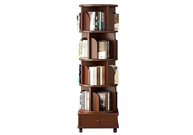 Con un diseño vertical que ahorra espacio, esta torre giratoria de madera maciza se adapta fácilmente a salones, estudios u oficinas. Su estructura de cuatro lados y rotación de 360 grados permite almacenar libros, revistas o documentos de forma ordenada y accesible desde cualquier ángulo. El acabado en nogal y la base móvil con ruedas universales facilitan su desplazamiento y encajan en ambientes modernos.