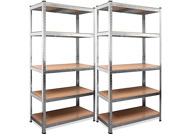 Con estructura modular versátil, el set de estanterías metálicas Nyana Home presenta cinco baldas ajustables de MDF y barras transversales para mayor estabilidad. Su capacidad total de 875 kg y montaje sin tornillos permiten organizar cargas pesadas con facilidad. El diseño galvanizado y los pies de plástico refuerzan la resistencia y protegen el suelo en cualquier entorno.