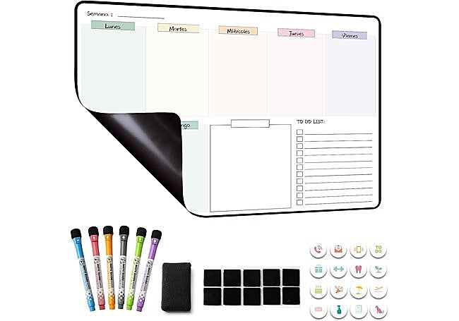 El Kit completo incluye seis rotuladores de colores, un borrador y dieciséis pegatinas magnéticas, lo que permite personalizar cada semana según las prioridades de cada usuario. A diferencia de otros calendarios semanales, este modelo ofrece una superficie resistente y flexible, fabricada en plástico de alta calidad, que soporta el uso continuado sin deteriorarse.