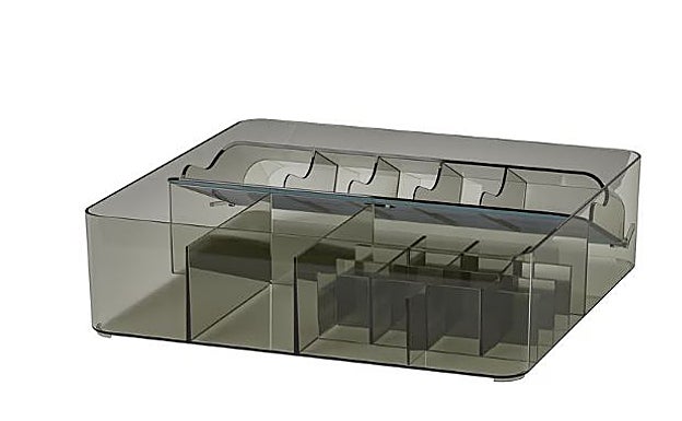 Ten siempre ordenados los cajones del baño, con esta caja multiespacio fabricada en plástico transparente oscuro que te permitirá encontrarlo todo más fácilmente. Utilizalo para ordenar tus cosméticos por 12,99€