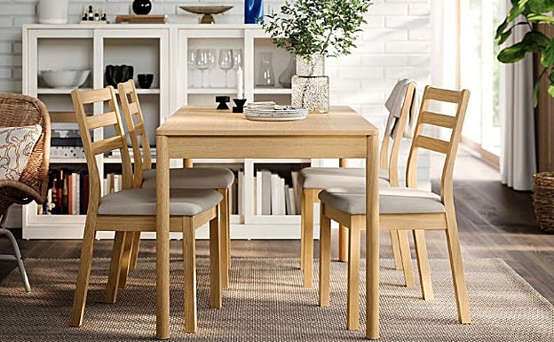 La funcionalidad que buscas y que encaja con cualquier ambiente la encontrarás en este conjunto de mesa y 4 sillas que son una novedad en Ikea. Están disponibles en chapa de roble y en color hueso, con asientos acolchados. ¡Súper cómodos! Los encontrarás por 489€.