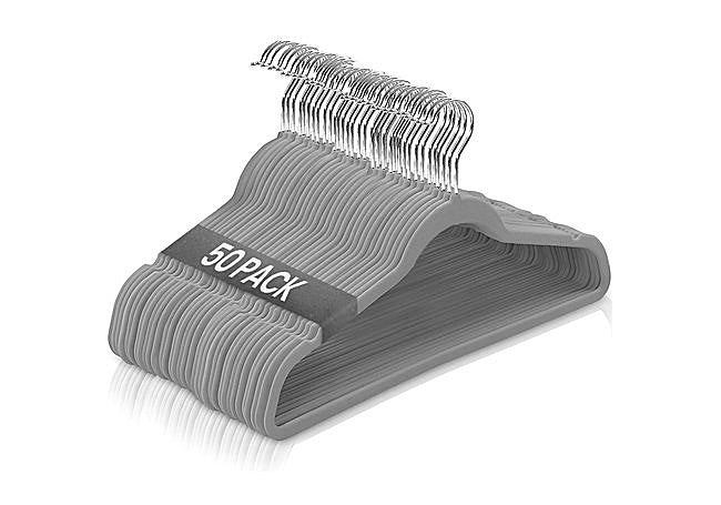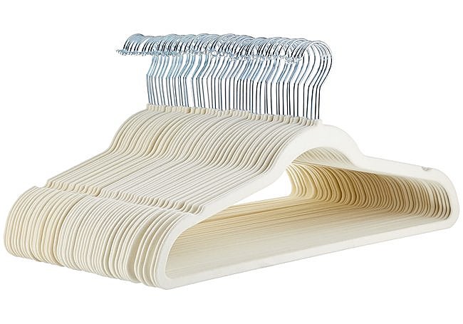 Los percheros de terciopelo de Amazon Basics en tono marfil tienen un perfil delgado. La superficie de terciopelo evita que la ropa se deslice, se arrugue o forme pliegues. Cada perchero soporta hasta 4.5 kg y tiene muescas en los hombros para evitar que las prendas se desplacen.