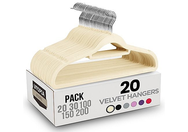 Las perchas de terciopelo Utopia Home en color marfil tienen un perfil delgado que ahorra espacio, una superficie antideslizante para evitar que la ropa se deslice, un gancho cromado giratorio, y una estructura de ABS resistente que soporta hasta 4,5 kg.