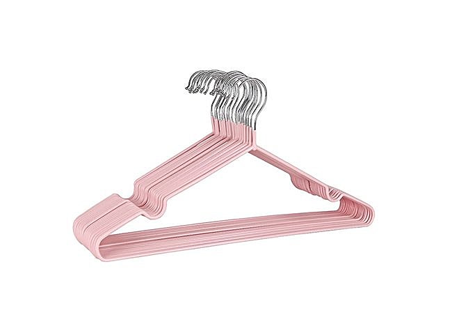 Con estructura metálica recubierta de goma en tono rosa, estas perchas DDGAO presentan un diseño extrafino de solo 0,4 cm que ahorra espacio en el armario. El revestimiento antideslizante y las muescas integradas en los hombros mantienen las prendas en su sitio, mientras que la barra inferior permite colgar pantalones sin que se deformen ni se deslicen.