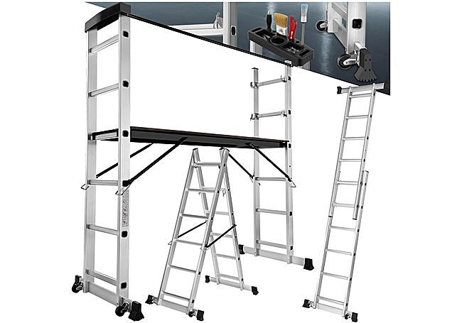 La escalera plegable de aluminio TecTake se adapta a cualquier tarea en el hogar o el trabajo. Su diseño 4 en 1 permite usarla como escalera simple, de tijera, andamio o plataforma para desniveles, facilitando desde pequeñas reparaciones hasta proyectos más ambiciosos.