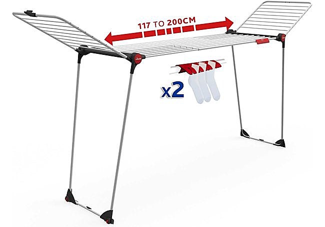 El Vileda Infinity Flex destaca en el mercado de tendederos por su diseño telescópico extensible, capaz de adaptarse a diferentes espacios y necesidades. Gracias a su estructura ajustable, este tendedero puede alcanzar hasta 2 metros de longitud, permitiendo secar prendas voluminosas como sábanas o mantas sin complicaciones. La combinación de alas elevadas y tubos extragrandes no solo aumenta la capacidad de secado, sino que también ayuda a reducir las marcas en la ropa y facilita el planchado posterior.