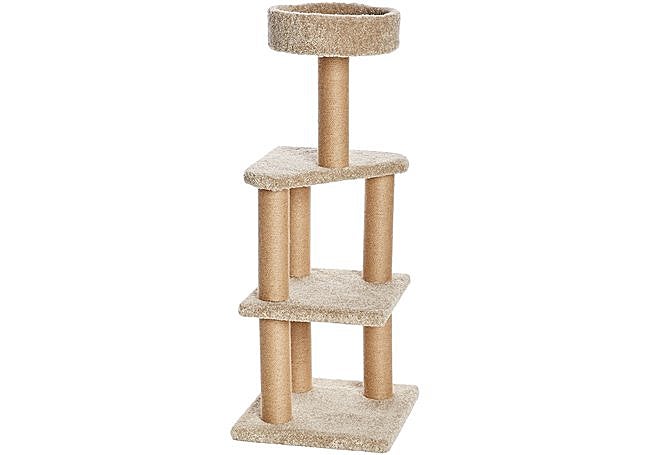 Si buscas una torre robusta para tu gato, la torre multinivel de Amazon Basics destaca por su diseño funcional en tonos beige. Sus tres plataformas permiten que los felinos salten y trepen con facilidad, y la base cuadrada ofrece buena estabilidad. Los siete postes recubiertos de yute fomentan el rascado natural, ayudando a mantener las uñas sanas.