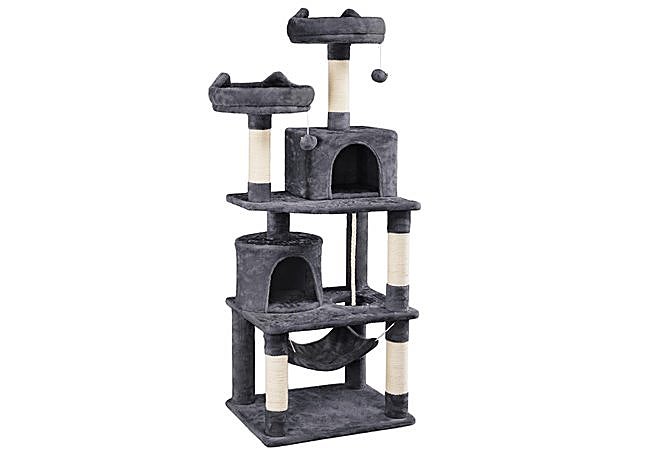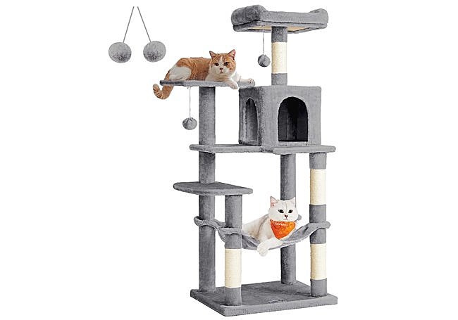 Más que una simple torre, el árbol rascador de 158 cm de Yaheetech convierte cualquier espacio en un paraíso vertical para gatos. Su diseño robusto ofrece dos camas superiores con bordes elevados, cuevas espaciosas y una hamaca suave, todo recubierto de felpa agradable. Los postes de sisal fomentan el rascado natural y cuidan las uñas, mientras que pelotas y cuerda colgante estimulan el juego.