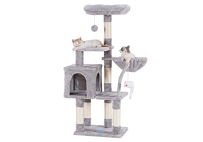 Gracias a su diseño multinivel y elegante acabado en gris claro, el árbol para gatos Feandrea destaca en cualquier hogar felino. Con 143 cm de altura, ofrece plataformas acolchadas, una cueva acogedora y una hamaca de felpa, creando un espacio ideal para el descanso y el juego. Los postes de sisal fomentan el rascado saludable, y los pompones colgantes estimulan la curiosidad de los gatos.