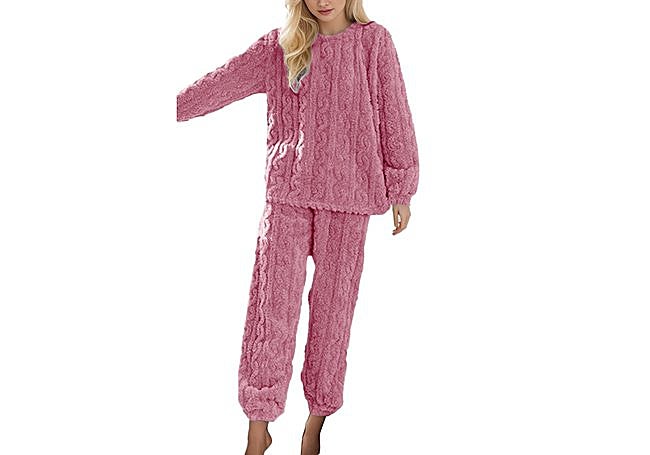Con tejido de forro polar suave, este conjunto de pijama largo de Sykooria ofrece una sensación mullida y cálida en cada uso. El diseño de dos piezas, con manga larga y pantalón, está confeccionado en poliéster para conservar el calor en noches frías. La estructura de flannel aporta ligereza y comodidad sin perder aislamiento térmico.