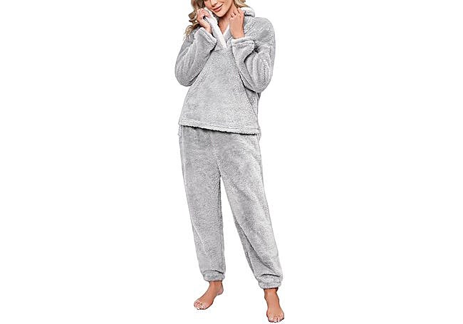 Este pijama de Niwicee está hecho de forro polar 100% poliéster, que proporciona un excelente aislamiento térmico. El conjunto de dos piezas incluye un pantalón largo con cintura elástica y prácticos bolsillos, diseñado para ofrecer calidez ligera, libertad de movimiento y conservar el calor corporal sin añadir peso innecesario.