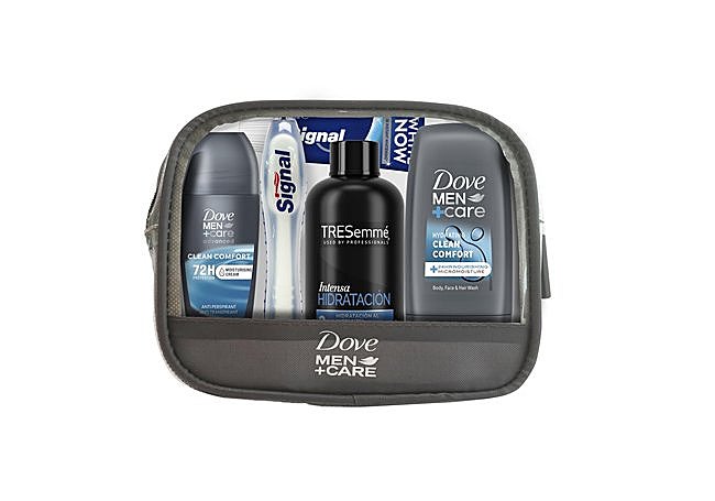 Pensando en quienes buscan practicidad sin renunciar al cuidado personal, el neceser mini de viaje Dove para hombre reúne lo esencial en un formato compacto. Este kit incluye desodorante roll-on, gel de ducha, champú, dentífrico y un cepillo de dientes plegable, todo en una bolsa transparente y ligera que facilita el paso por controles de seguridad.