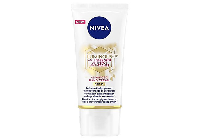 La crema de manos de NIVEA contiene LUMINOUS 630 y ácido hialurónico. Proporciona hidratación durante 24 horas y contiene SPF 15 para protección solar. Su textura ligera se absorbe rápidamente. El ácido hialurónico es conocido por su capacidad para retener la humedad.