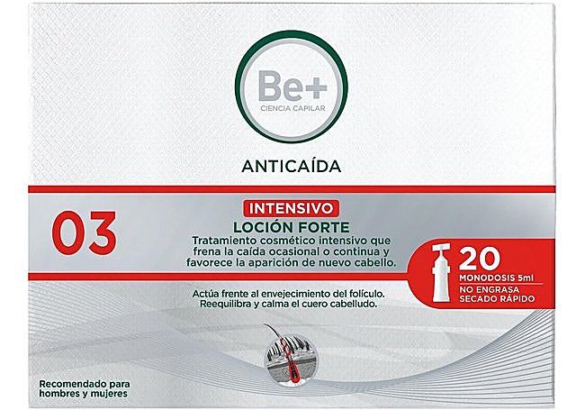 Be+ Anticaída Loción Forte se presenta en ampollas monodosis y contiene una fórmula concentrada. Su formato de 20 viales permite una aplicación precisa y cómoda. La textura ligera facilita la absorción, permitiendo que los ingredientes activos penetren en el cuero cabelludo. Esta loción está enriquecida con nutrientes esenciales.