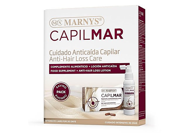 El CAPILMAR PACK de Marnys es un tratamiento de 30 días que combina cápsulas y loción con biotina, extractos botánicos y aminoácidos. Este formato combinado incluye cápsulas para uso interno y loción para uso externo, proporcionando un enfoque integral para el cuidado del cabello.