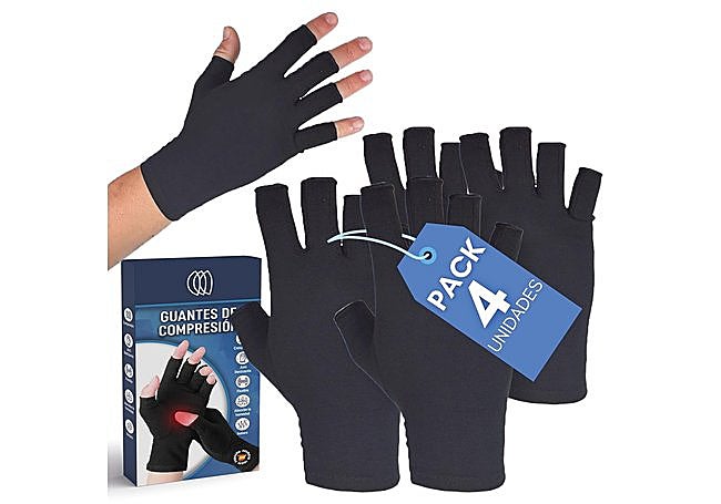 El pack incluye cuatro guantes de compresión fabricados con tejido elástico y diseño sin dedos. Ofrecen compresión suave para mejorar la circulación sanguínea y reducir la fatiga en las manos. El material transpirable proporciona comodidad durante un uso prolongado, y el diseño duradero mantiene sus características tras múltiples lavados.