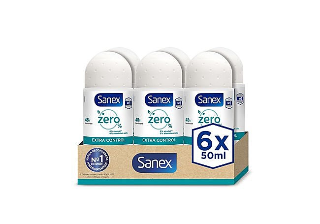 Sanex Zero% Extra Control roll-on ofrece control del olor hasta 48 horas sin alcohol ni sales de aluminio. Incluye ingredientes antibacterianos suaves y se presenta en envase reciclable, combinando control del olor y materiales con menor impacto ambiental.