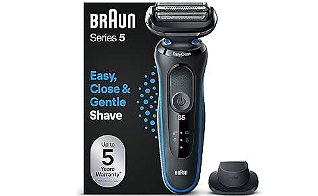 La Braun Series 5 es una afeitadora eléctrica que destaca por sus 3 láminas flexibles que se adaptan a los contornos faciales. El sistema EasyClean permite una limpieza rápida sin retirar el cabezal. La batería de iones de litio ofrece hasta 50 minutos de uso y es 100% resistente al agua, adecuada para uso en seco y mojado.