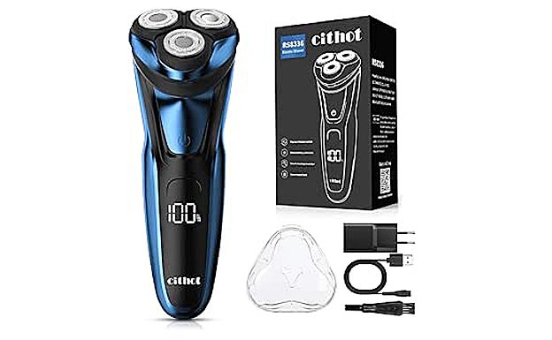 La máquina de afeitar CITHOT viene equipada con cuchillas rotativas y una recortadora de barba. El cabezal es reemplazable y cuenta con un sistema 3D que se adapta a los contornos faciales para un afeitado suave. Su pantalla LCD indica la batería restante y es resistente al agua con certificación IPX7, lo que permite su uso en seco o húmedo.