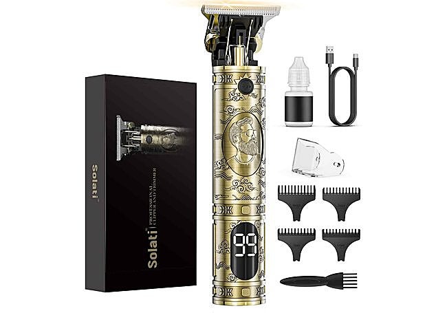 La Solati Maquina de Cortar Pelo Hombre se ha posicionado como una opción destacada para quienes buscan una herramienta versátil y eficiente tanto para el hogar como para el salón. Este cortapelos eléctrico, diseñado en un elegante color dorado y con acabados metálicos, incorpora una tecnología de cuchillas de titanio autoafilables que garantizan un corte preciso en cada uso. Su pantalla LED permite controlar fácilmente el estado de la batería, una función especialmente útil para evitar interrupciones inesperadas mientras se recorta la barba o el cabello.