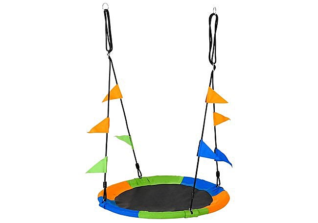 El columpio nido de Outsunny, con estructura metálica y asiento redondo de 100 cm, destaca por su superficie amplia y resistente. Su diseño multicolor y las banderolas decorativas añaden un toque alegre al espacio exterior.