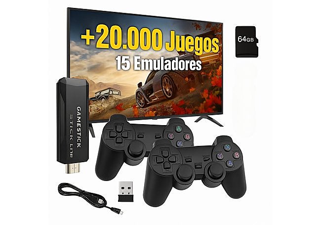 Esta consola retro HDMI utiliza tecnología NANYA, integra 15 emuladores y más de 20.000 juegos clásicos en una tarjeta de 64 GB. Incluye dos mandos inalámbricos y salida 4K. Su diseño plug & play permite la conexión sin necesidad de configuración adicional.