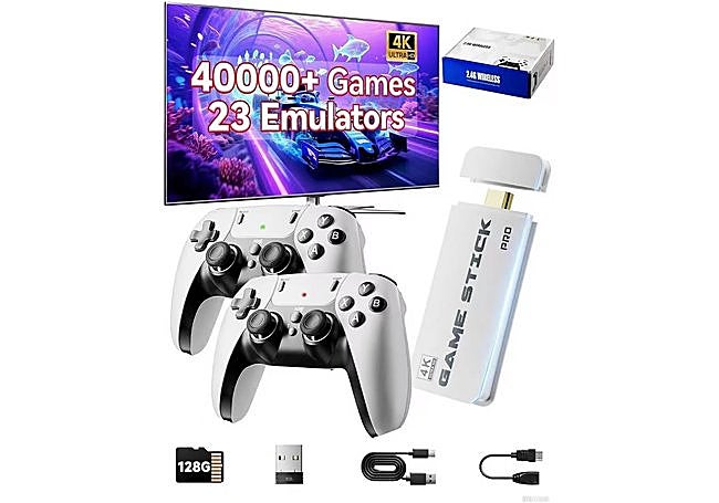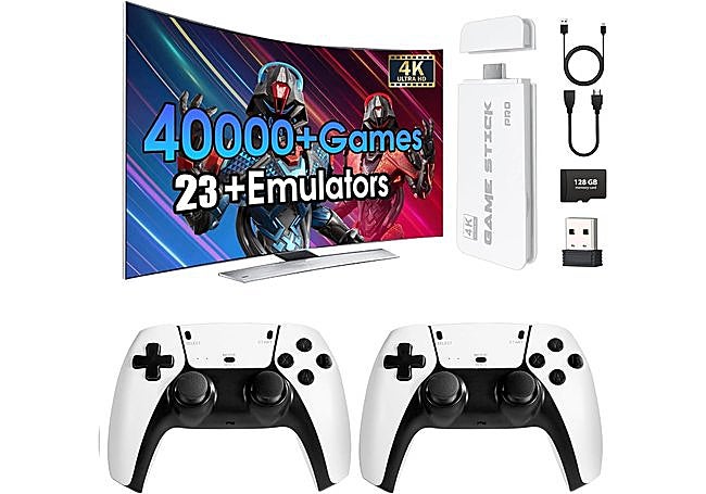 El sistema retro de WUYJTIF integra más de 40.000 juegos y 23 emuladores en un stick compacto con salida HDMI 4K. Incluye dos mandos inalámbricos y almacenamiento de 128 GB, lo que permite disfrutar de una amplia variedad de juegos clásicos. Ofrece imágenes nítidas y una configuración plug & play, facilitando su uso inmediato y sin complicaciones.